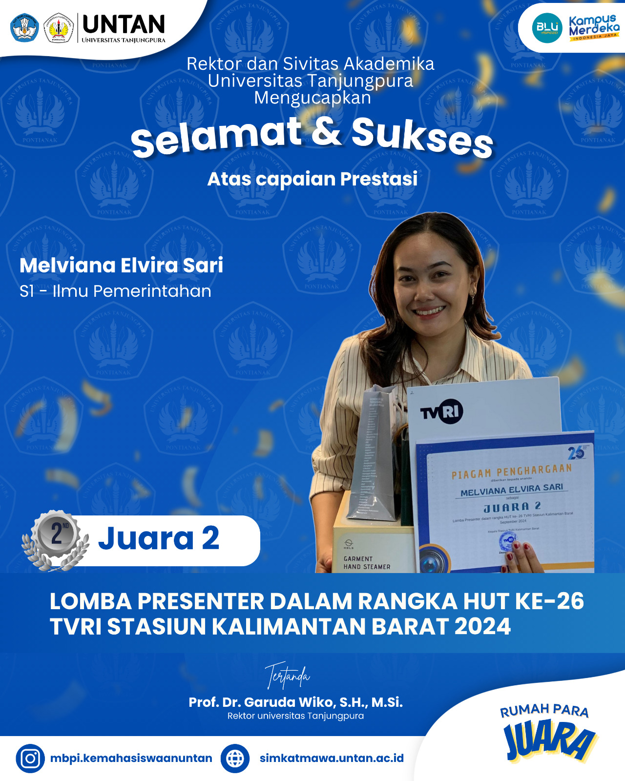 Prestasi Mahasiswa: Melviana Elvira Sari (S1-Ilmu Pemerintahan FISIP UNTAN) Juara 2 Lomba Presenter Dalam Rangka HUT TVRI Kalimantan Barat ke-26 Tahun 2024